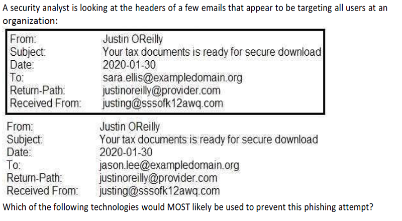 A security analyst is researching ways to improve the security of a company's email system to mitigate emails that are impersonating company executives. Which of the following would be BEST for the analyst to configure to achieve this objective?
