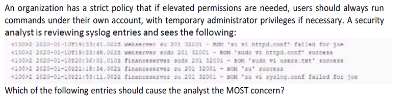 <100> 2020-01-10T19:33:48.003z webserver sudo 201 32001 = BOM ' su vi syslog.conf failed for joe